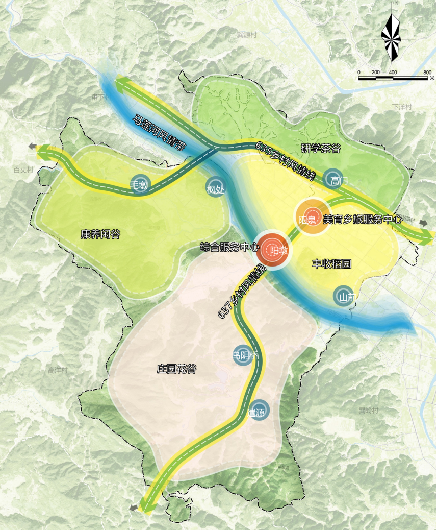 一、村庄基本情况 阳墩村系浦城县仙阳镇下辖行政村,坐落在仙阳镇第一大畈麒麟畈,下辖7个自然村,村域面积1177.55公顷,其中,村庄建设用地19.49公顷。村庄内景观资源丰富,呈现出山、田、村等层次丰富的景观格局,马莲河成为串联整个区域的廊道景观,村庄点缀其中,宁静雅致。 二、规划情况 (一)规划核心内容 围绕旧村改造,构建“双心合璧、三线串景、四区联动”的规划结构:依托阳泉村万亩田心的独特景观和交通节点优势,打造山谷联动的美育乡旅服务中心,建设“一主七次”乡村联盟的综合服务中心;利用马莲河风情带、635、637乡村风景线串景;规划康养闲谷、庄园花谷、研学茶谷、丰收稻园四大分区。